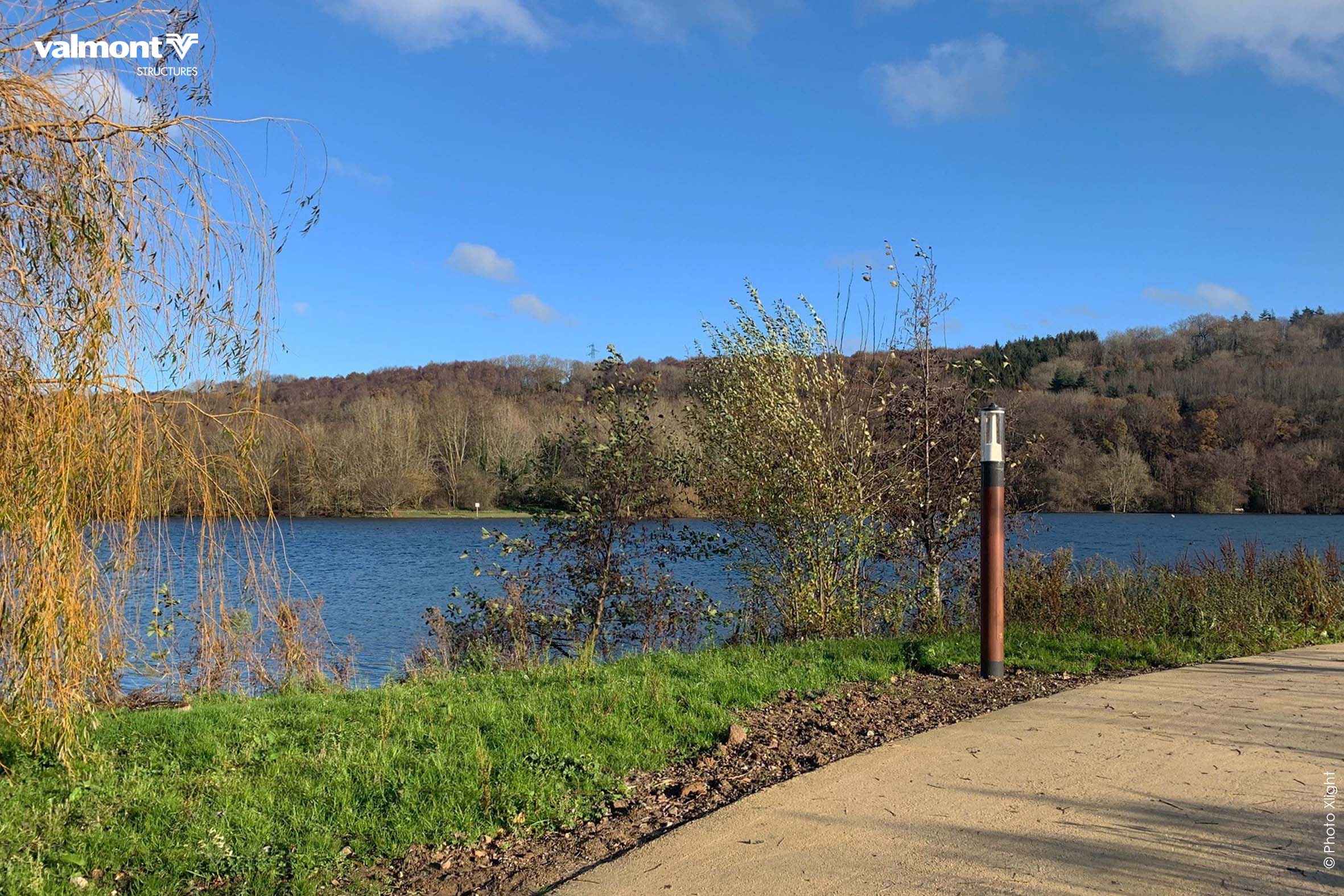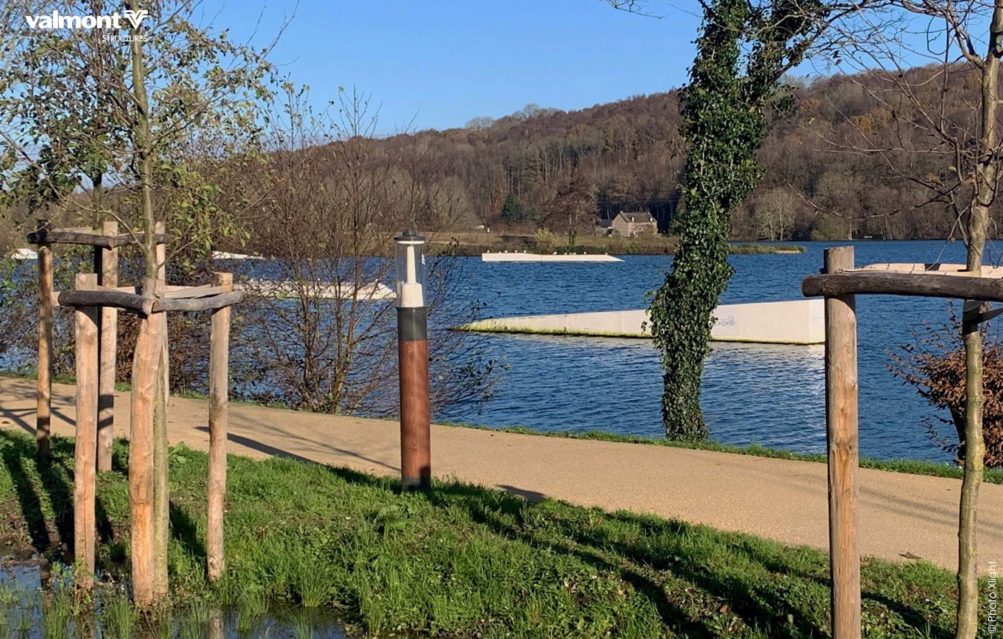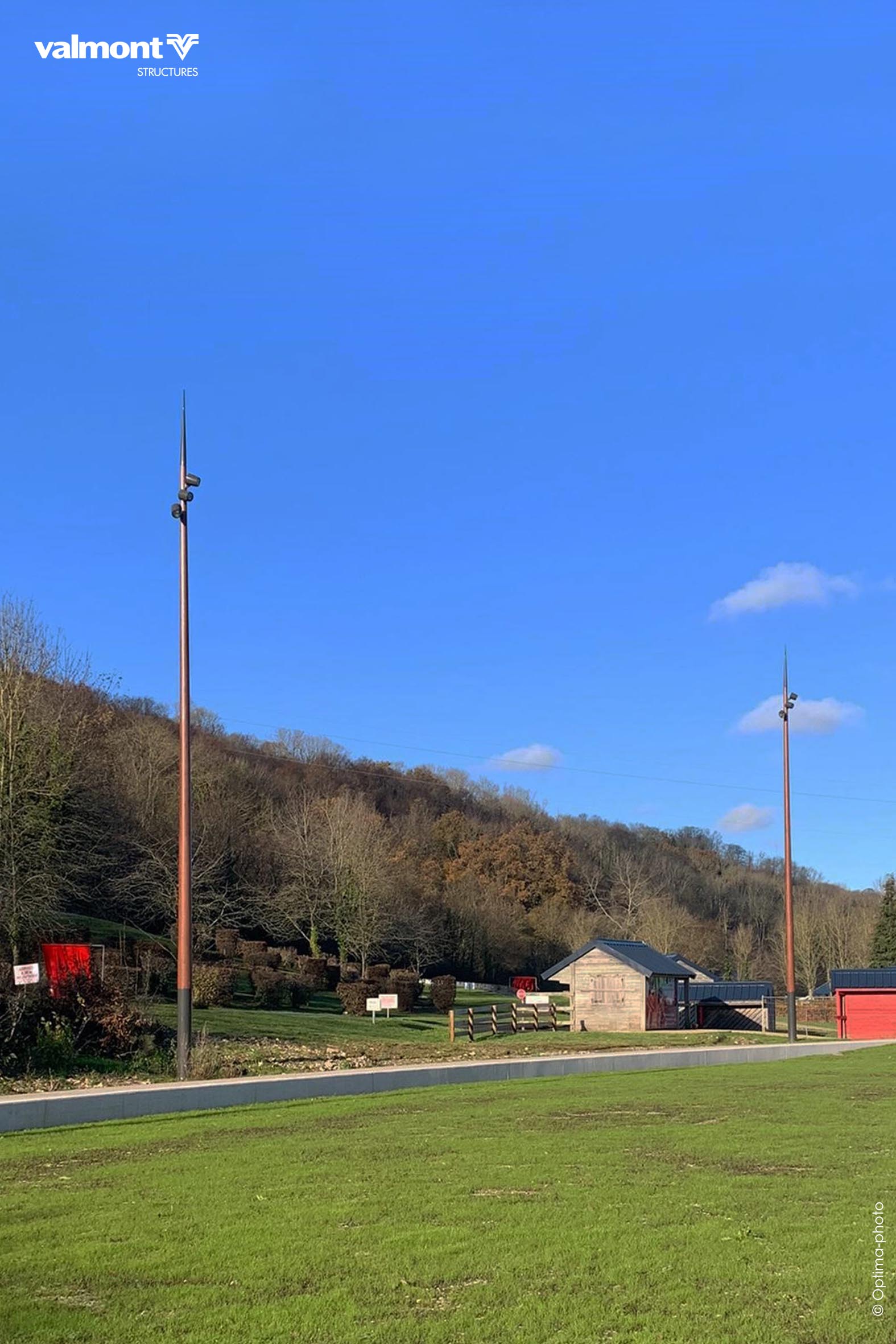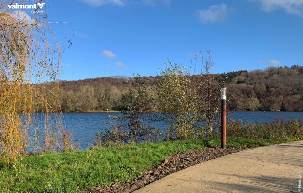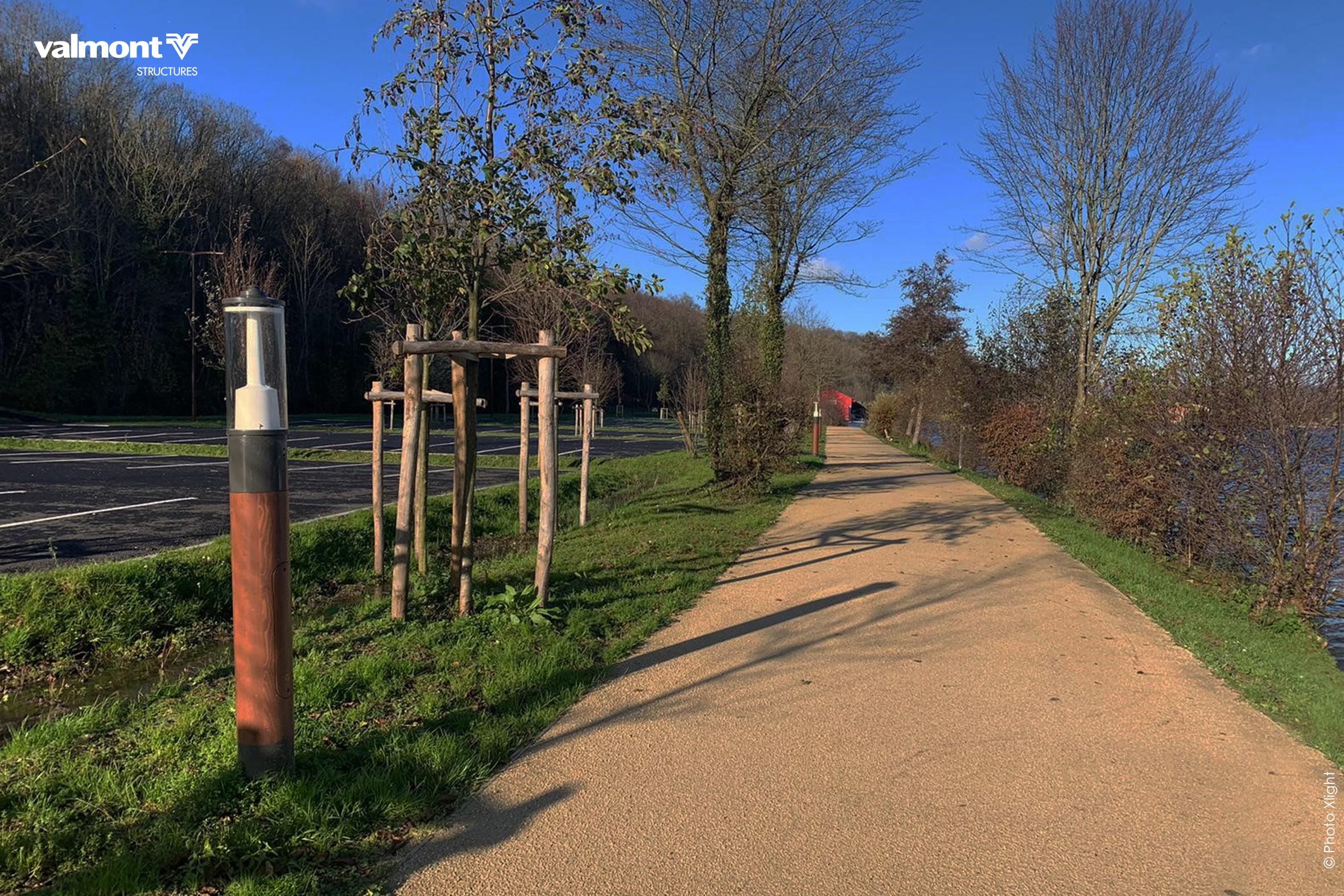 En harmonie avec leur environnement naturel, les mats bois Valmont Tehomet se fondent dans ce paysage de la Vallée de la Durdent. Que ce soit en version XL avec des Pallas support projecteurs pour les zones stratégiques, ou version plus discrète avec des bornes spéciales Kaumpuki pour les zones plus sauvages, chaque support a été pensé selon l’usage des lieux, le tout dans un souci d’intégration optimal.