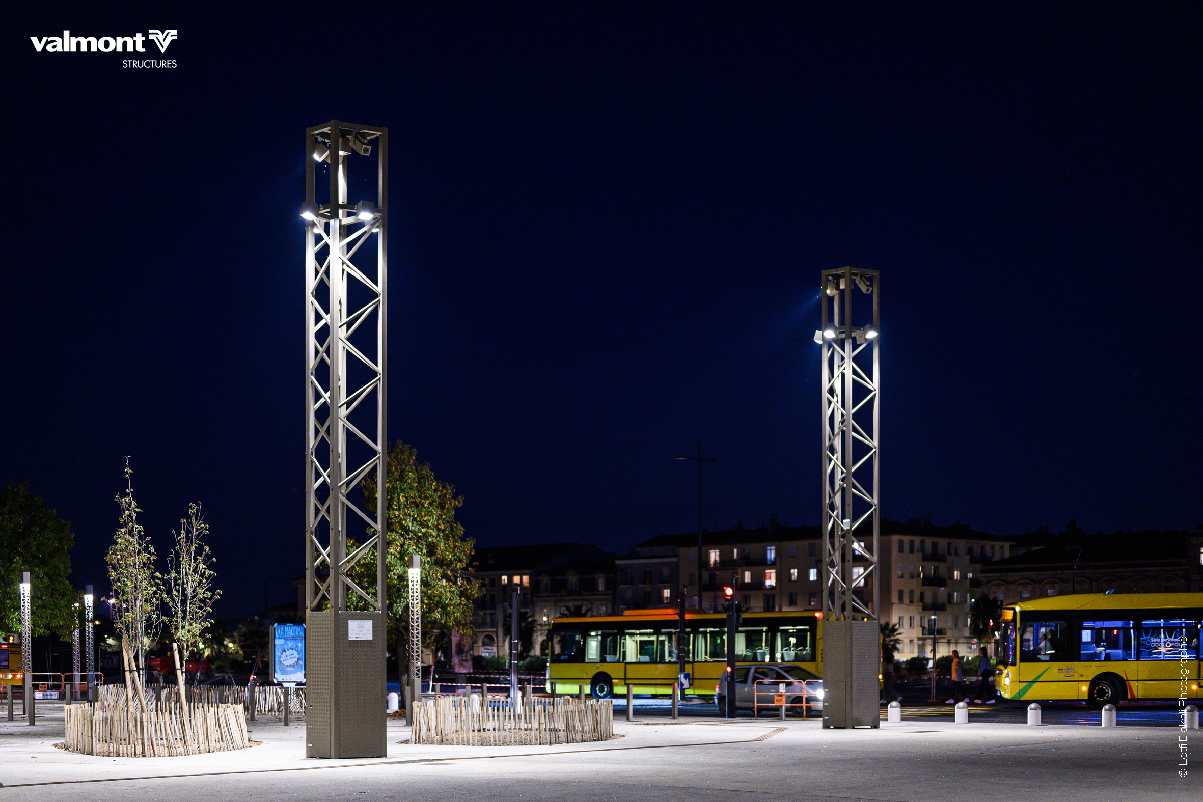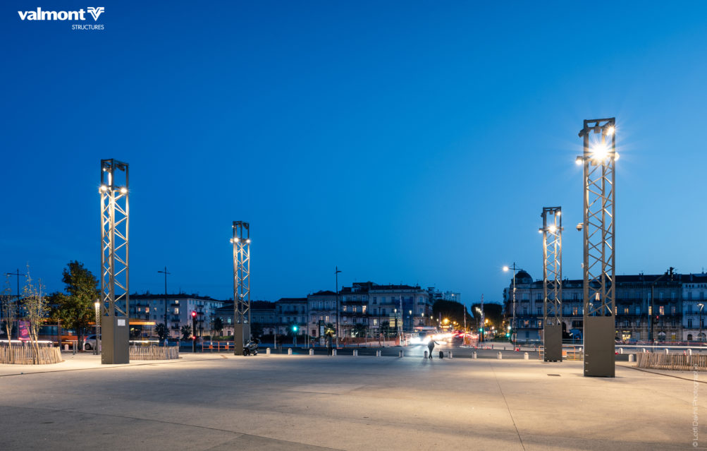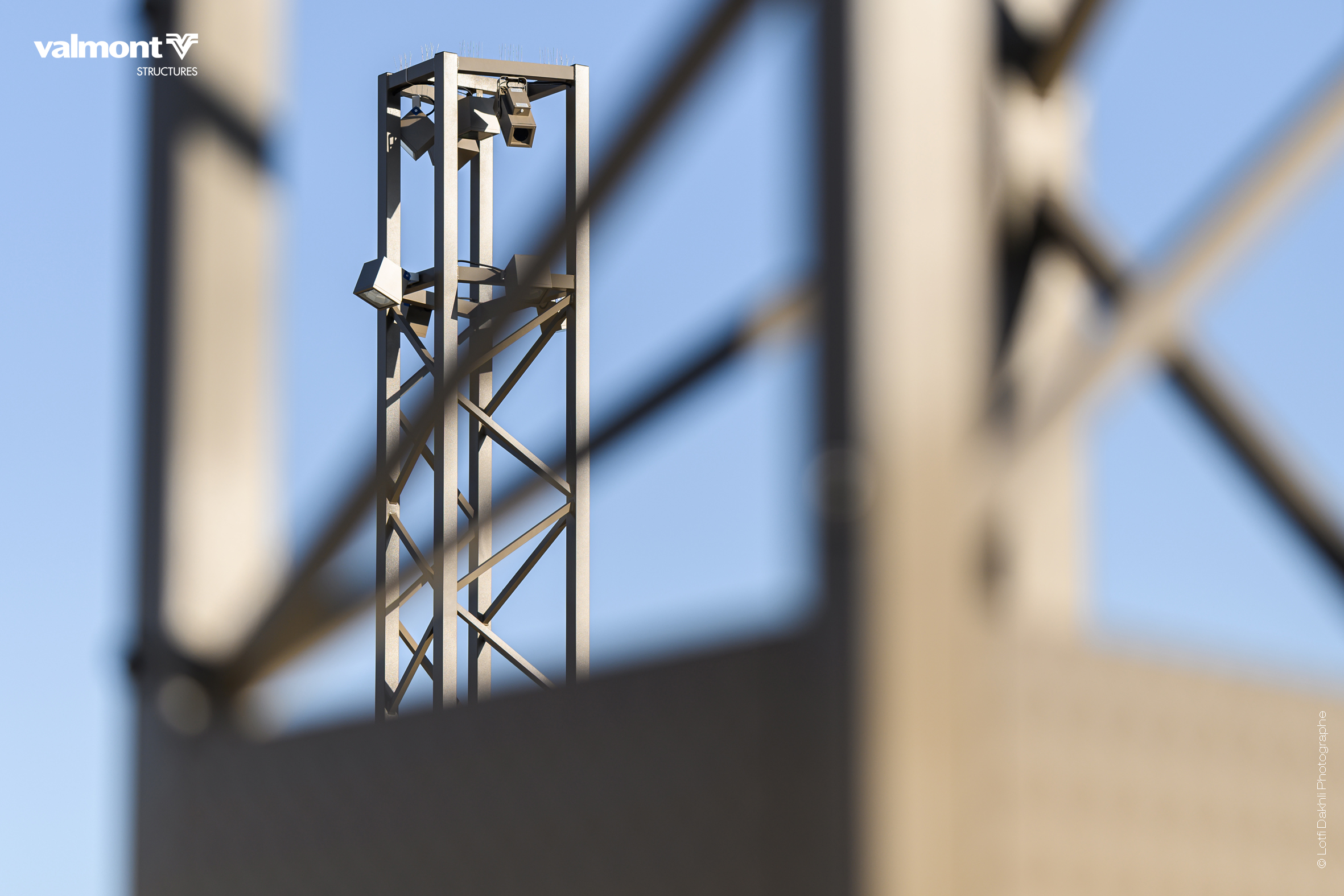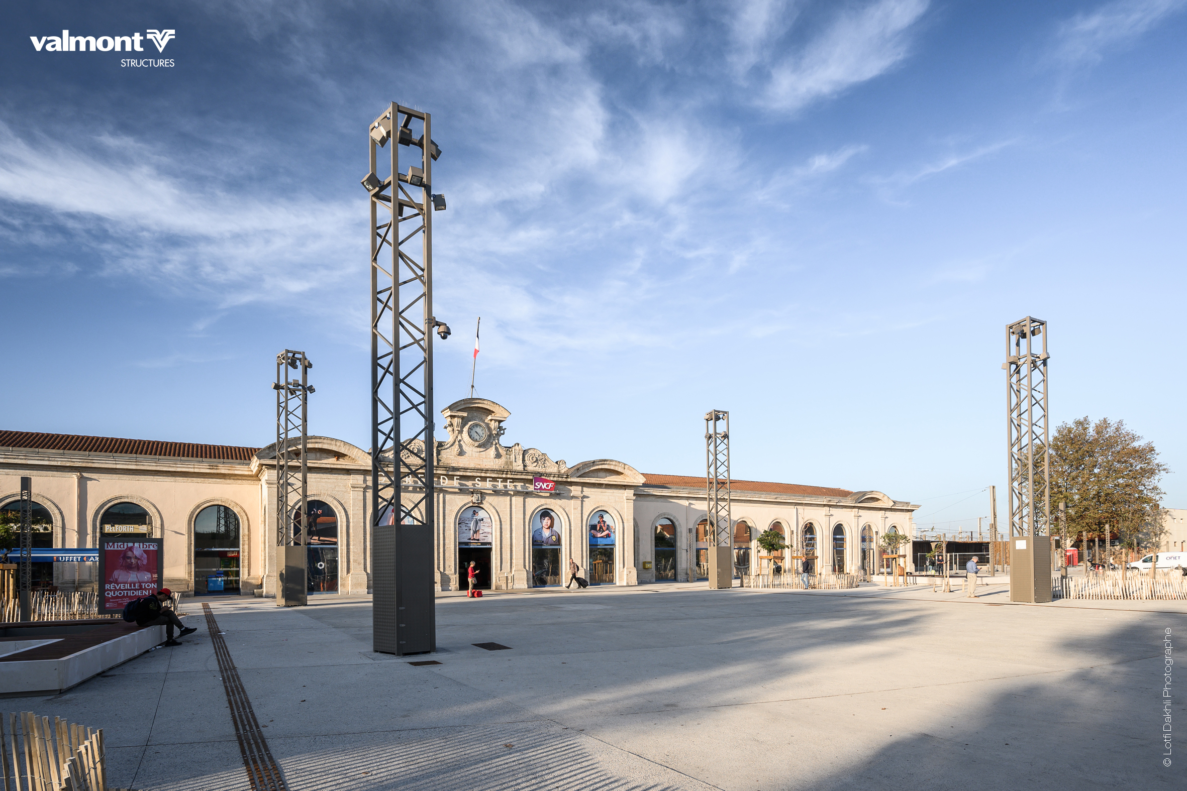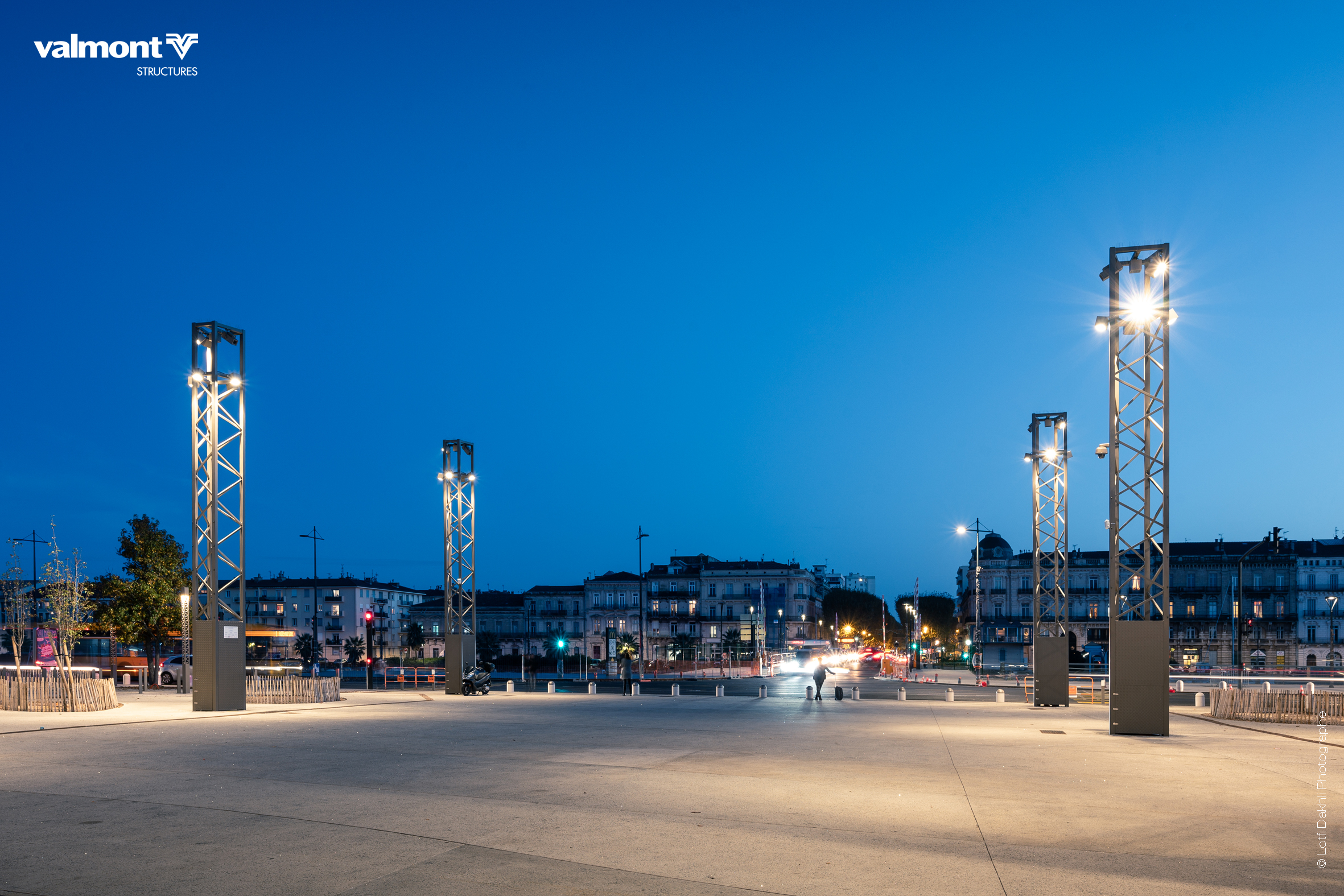 « L’architecture des mâts fait référence aux ouvrages de franchissement des canaux de cette ville maritime et au langage ferroviaire. Tels des ponts-bascules, ils sont constitués d’un enchevêtrement de poutres façon ‘Eiffel’. Imposants mais ajourés, ils ont également l’avantage de dégager le champ visuel du parvis”