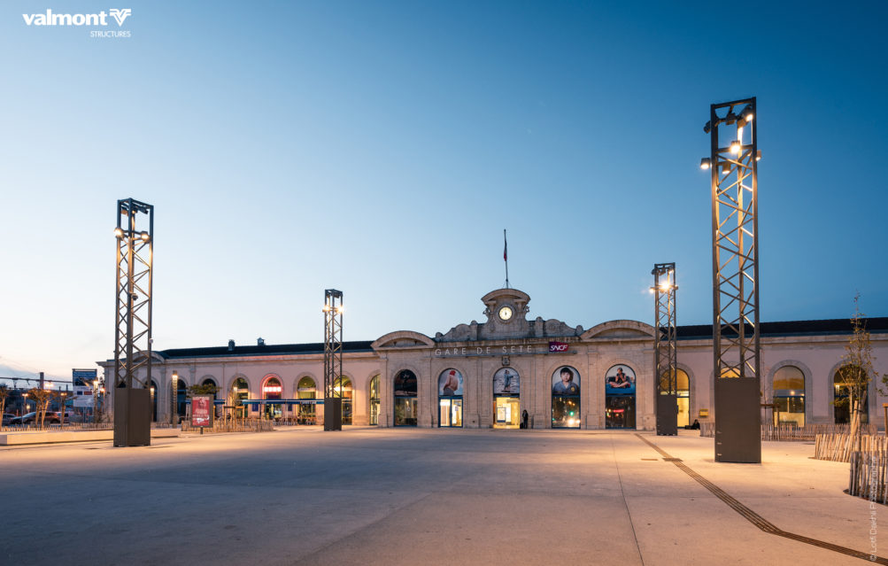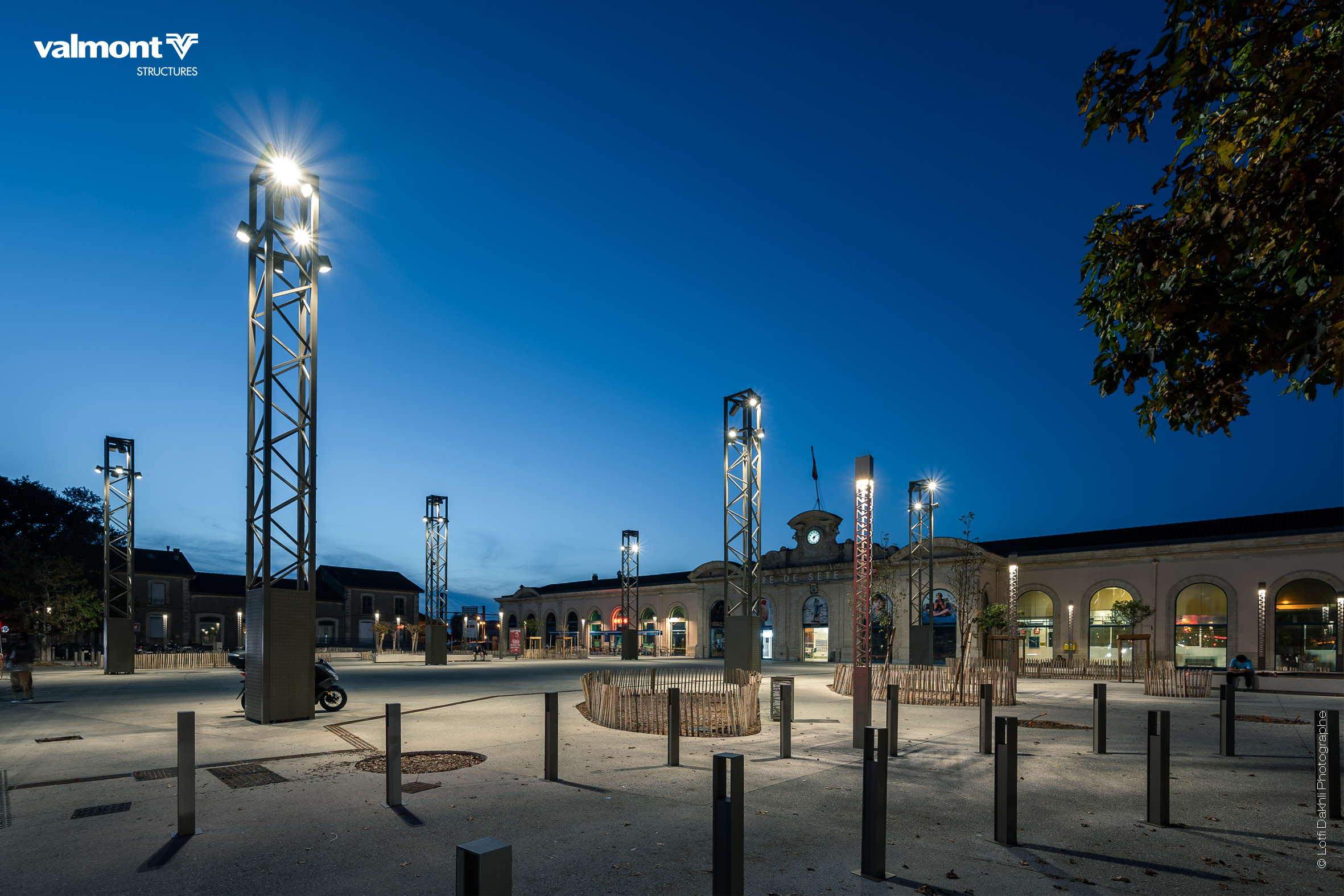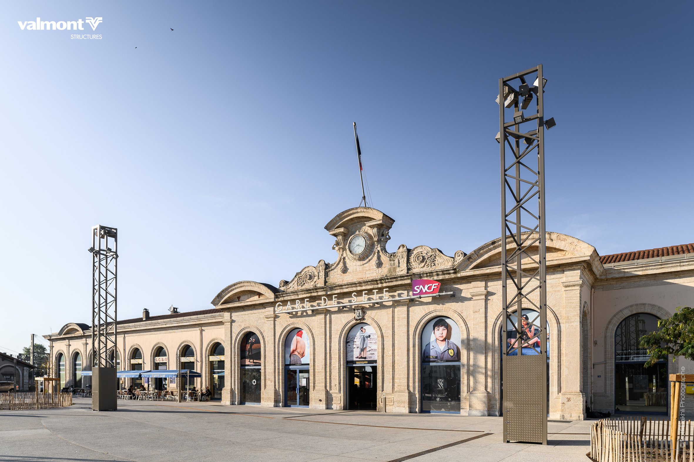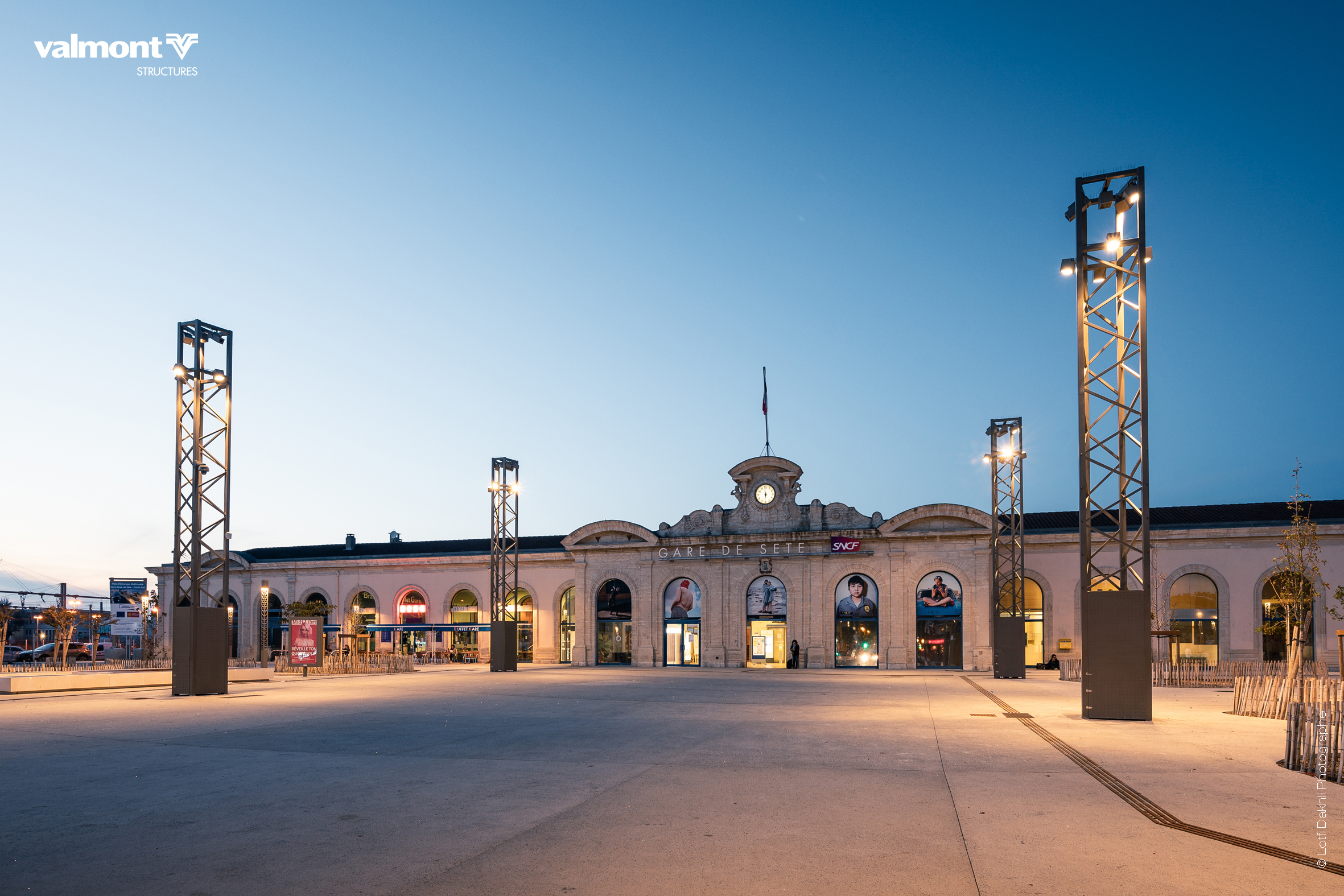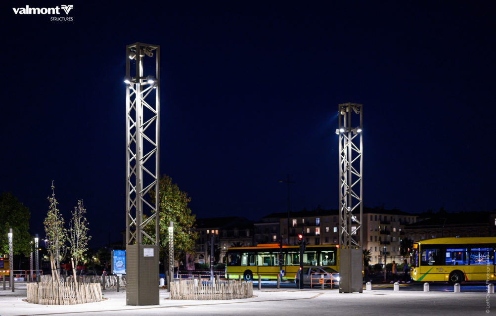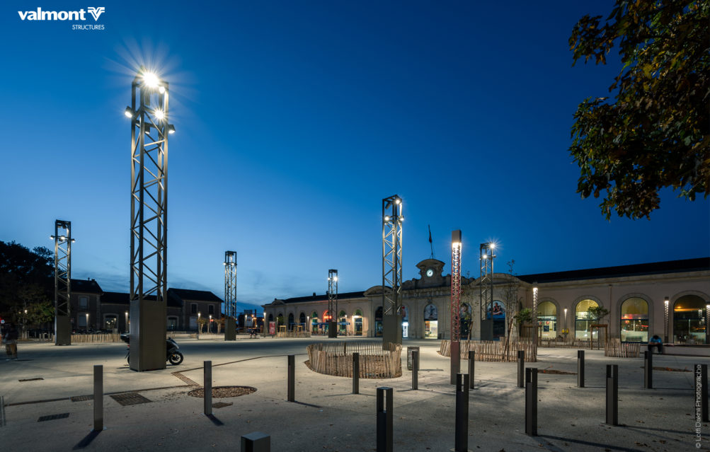 « L’architecture des mâts fait référence aux ouvrages de franchissement des canaux de cette ville maritime et au langage ferroviaire. Tels des ponts-bascules, ils sont constitués d’un enchevêtrement de poutres façon ‘Eiffel’. Imposants mais ajourés, ils ont également l’avantage de dégager le champ visuel du parvis”