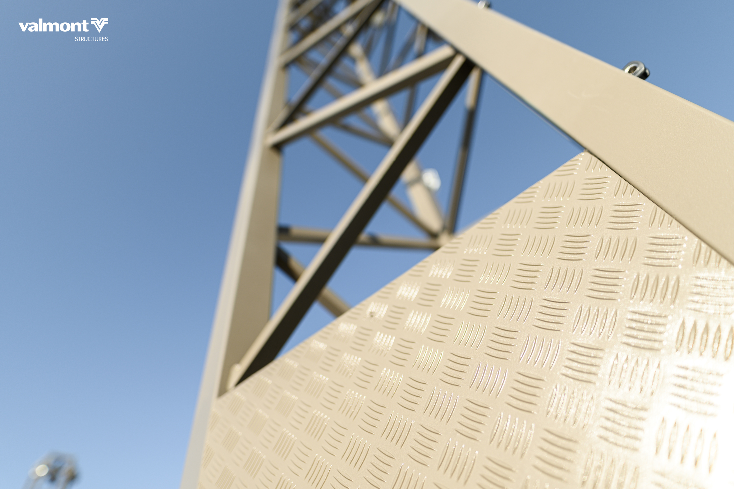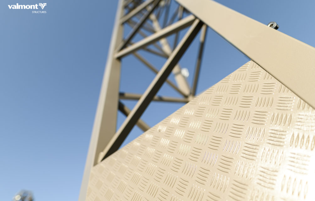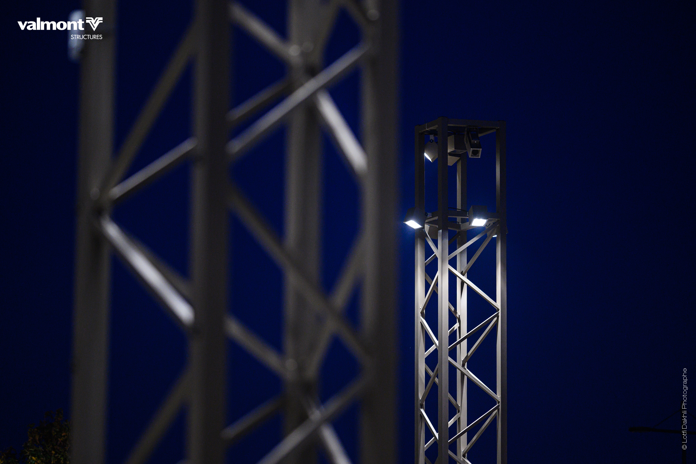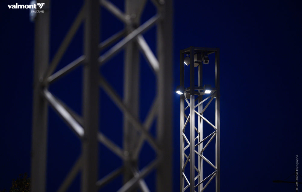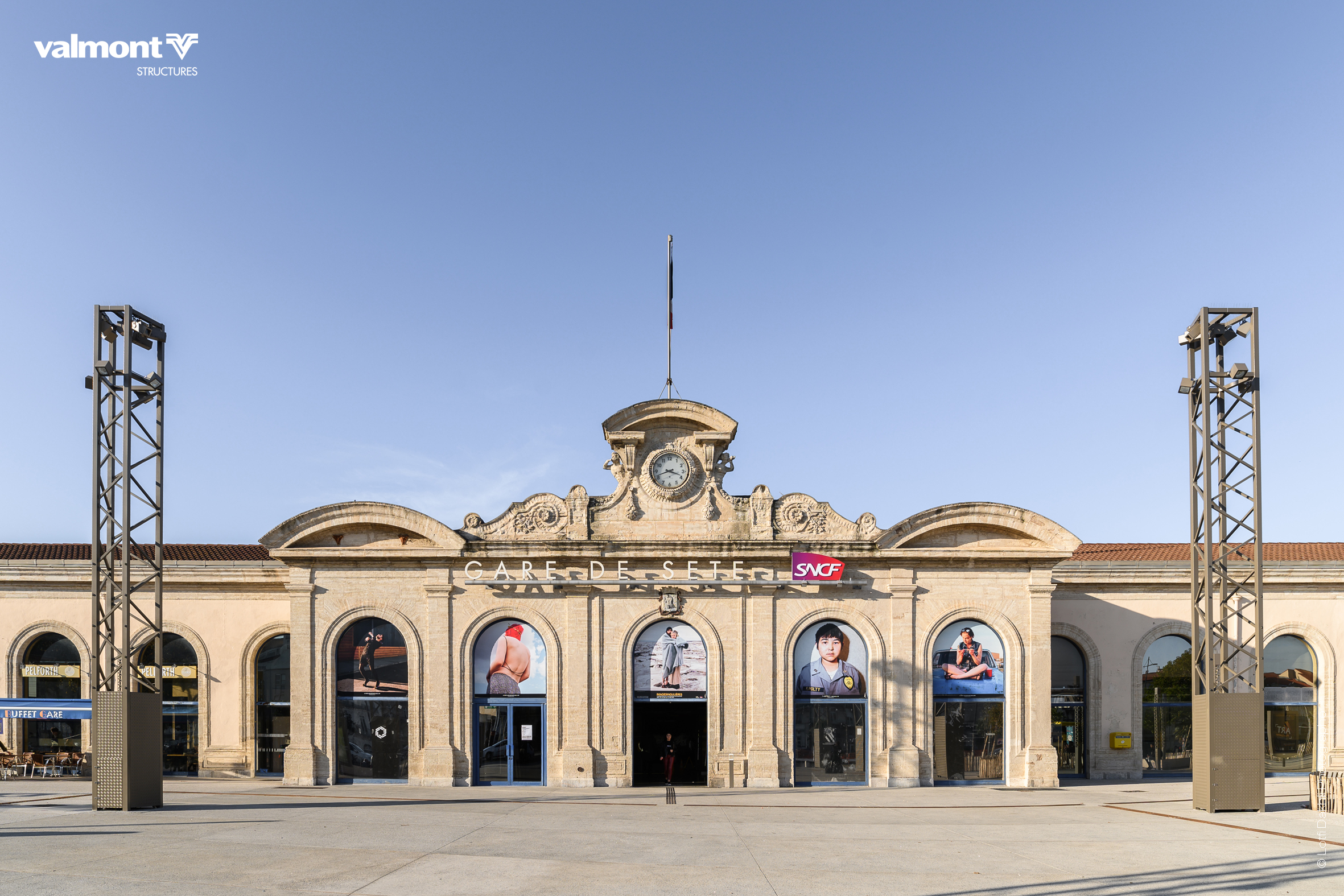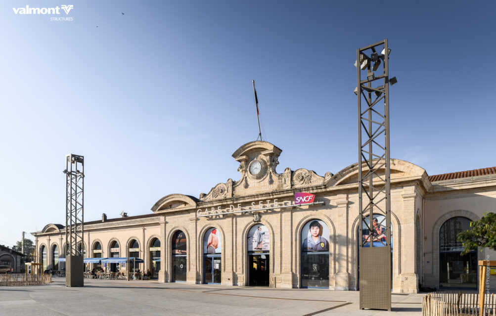 « L’architecture des mâts fait référence aux ouvrages de franchissement des canaux de cette ville maritime et au langage ferroviaire. Tels des ponts-bascules, ils sont constitués d’un enchevêtrement de poutres façon ‘Eiffel’. Imposants mais ajourés, ils ont également l’avantage de dégager le champ visuel du parvis”